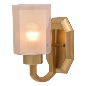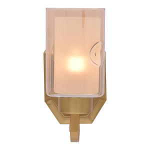 Behold the elegance of this gold wall light featuring an arm, gracefully cradling an exquisite glass shade. One arm presents a frosted glass, casting a soft, diffused glow that imparts a sense of warmth and subtlety. Along with a clear glass, distinguished by a distinctive indent, adding a touch of modern flair to its classic design.