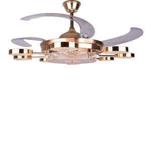Introducing Angel Wings Ceiling Fan an extraordinary fusion of elegance, innovation, and functionality. This exquisite ceiling fan doubles as decor when unlit features a luxurious gold frame adorned with crystal glass rings and a majestic centerpiece, all accompanied by foldable fan wings for added versatility.