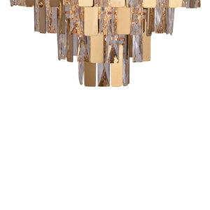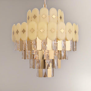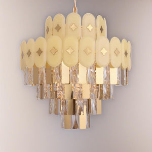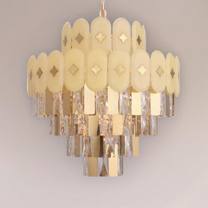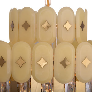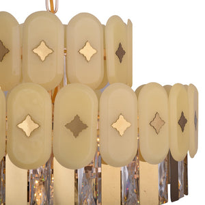 The chandelier features a circular frame. At the sides of the chandelier composed of yellow-tinted glass plates arranged in a mesmerizing pattern. The yellow hue casts a soft, warm glow when the chandelier is lit, infusing the room with a gentle and welcoming radiance. There are also crystals and golden plates that hang below to create a stunning visual effect.