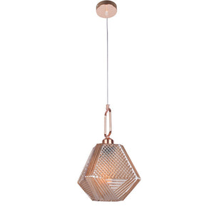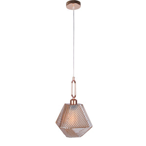 A striking lighting fixture that exudes contemporary elegance with a touch of artistic flair. This pendant light features an amber textured glass shade beautifully shaped as a three-dimensional hexagon, creating a captivating and visually intriguing design.