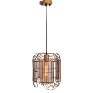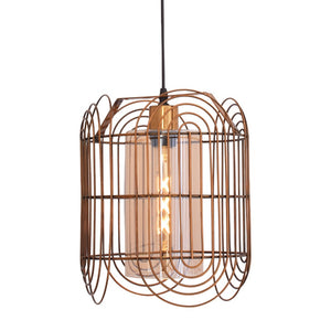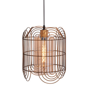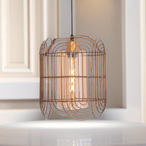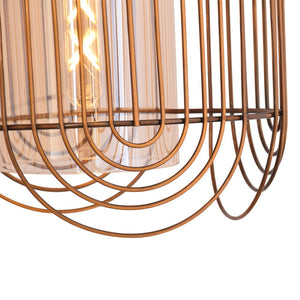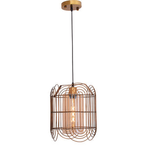 Elegantly suspended from above, this pendant light boasts a timeless aesthetic with its antique bronze designer cage. The intricate metalwork encases a long, amber glass, creating a warm and inviting glow that emanates from the heart of this vintage-inspired masterpiece.