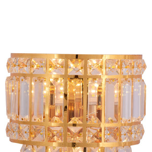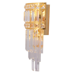 Sleek angled glass prisms dangle from a metal frame in 3 tiers for layers of sparkling style. This modern take on the classic sconce is surely a conversation starter. The look has the allure of restoration era luxury for interiors ranging from industrial to glamorous.