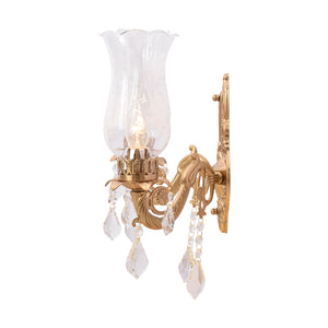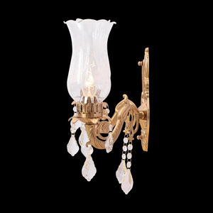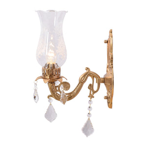 The gold wall light is a stunning piece of decor that exudes elegance and sophistication. The wall light is designed with a glass shade that is adorned with a beautiful white flower pattern, which adds a touch of delicate charm to the piece.