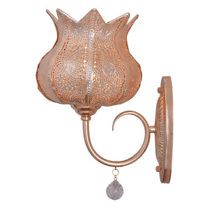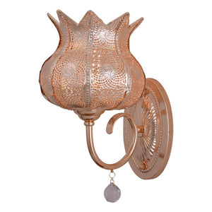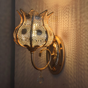 The centerpiece of this wall light is the lotus-shaped open frame, also finished in resplendent gold. The frame's design is reminiscent of a delicate lotus flower, with its petals gracefully unfolding. However, the frame is netted, allowing light to filter through and create a mesmerizing pattern on the surrounding surfaces.