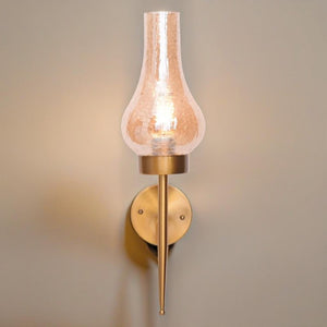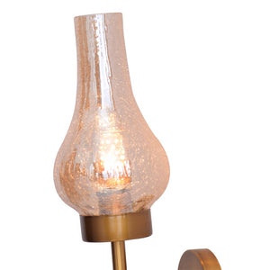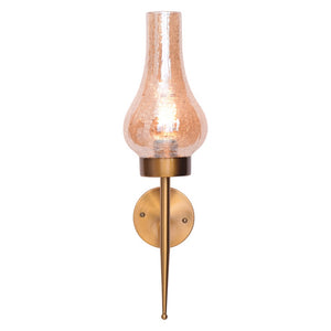 A captivating wall light that seamlessly blends elegance with a touch of sparkle. This exquisite lighting fixture features a gold frame embracing an amber glass shade that widens at the bottom and tapers to a delicate top, adorned with mesmerizing glitter accents.