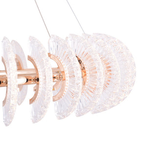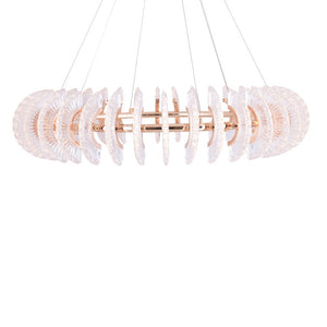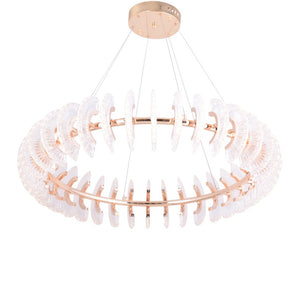 Luminosa Chandelier is a breathtaking masterpiece that seamlessly blends opulence and modernity. Suspended from the ceiling, its centerpiece is a golden halo tube, exuding a warm, luxurious glow. Draped around this lustrous core are a multitude of glass cut pieces, each meticulously crafted and adorned with embedded LEDs.